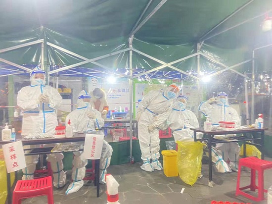 寒冷冬夜,我们与光同行。神康抗疫小分队到达采集点,开始做采样准备工作,防护服难穿,队员们经验十足,互帮互助,很快速的就穿戴整齐了,只为尽快的开启采样工作。